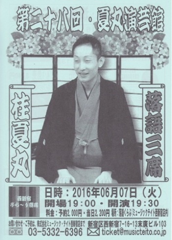 さあ、偶数月第一火曜日の吉例企画でございますよ!たくさんのご来場、心よりお待ち申し上げます!今度の火曜日晩は、是非ともミュージック・テイトに!6月7日(火)『第28回・夏丸演芸館』開場…19時 開演…19時30分 終演…21時30分会場…西新宿ミュージック・テイト料金…(予約)2,000円 (当日)2,200円予約…ticket@musicteito.co.jp出演…桂夏丸「猫怪談」「橘ノ圓物語」他一席+α 私:音楽とココが変だよ演芸界「ココが変だよ演芸界」って、何を話せばいいんだ?多少、辛口の中身でもいいのかね?夏丸さんの指示を聞かないといかんな、これは(笑)。…とにかく、間違いなく面白い会になるとは思います。確証は持てませんが(苦笑)。あと、ご予約ですが0ps388121401v2y@ezweb.ne.jpでも承ります。是非とも、よろしくお願いいたします!