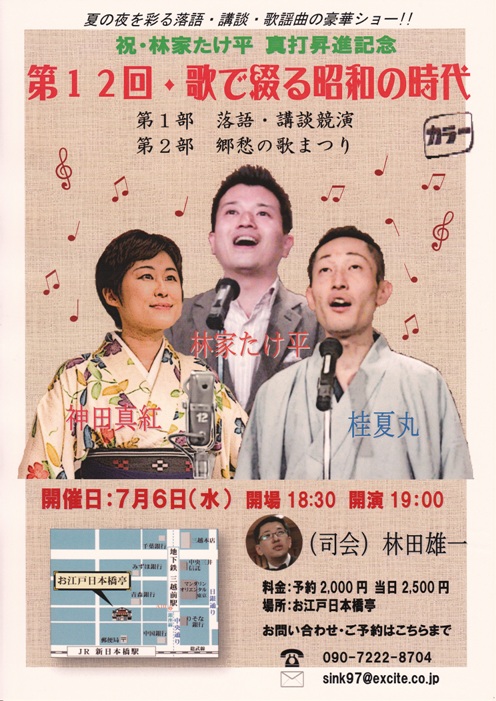 全国3500万人(?)の演芸ファンの皆さま!7月6日(水)晩は、是非とも花の東京のまん真ん中、お江戸日本橋亭にお出でください!今年は、日本橋亭の都合でこの1回限り!これを逃したら、次は来年1月になってしまいます!夏の夜の、豪華共演をお楽しみ下さいませ!『第12回・歌で綴る昭和の時代』7月6日(水)会場…お江戸日本橋亭http://www.ntgp.co.jp/engei/nihonbasi/index.html開場…18時30分 開演…19時 終演…21時(予定)料金…(予約)2,000円 (当日)2,500円出演…林家たけ平、桂夏丸、神田真紅 (歌謡ショー司会&構成)林田雄一第1部…「落語・講談競演」第2部…「なつかしの歌声・郷愁の歌まつり」予約先(メール)sink97@excite.co.jp (電話)09072228704また、下記の電話番号・メールアドレスでもご予約・お問い合わせを受け付けます。4890mffs@jcom.zaq.ne.jp0ps388121401v2y@ezweb.ne.jp09041832028老いたる者には過ぎにし青春の郷愁を、若人には呼べど去にて再び帰り来らぬ、古の幻を!!落語ファンも、講談ファンも、『なつかしの歌声』ファンもご満足いただける会にすべく、ただいま歌謡ショー構成の真っ最中であります!たくさんのご来場、心よりお待ち申し上げます!
