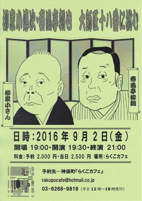 いよいよ明日の晩に開催です!たくさんのご来場、心よりお待ち申し上げます!「柳家小傳次・春風亭朝也 大師匠十八番に挑む」開催日:9月2日(金)会場:神保町らくごカフェ開場:19時 開演:19時30分 終演:21時すぎ(予定)出演:柳家小傳次、春風亭朝也、(司会)林田雄一予約先:rakugocafe@hotmail.co.jp (メール) 03-6268-9818 (電話・平日12時~18時受付)また、下記の電話番号・メールアドレスでもご予約・お問い合わせを受け付けます。4890mffs@jcom.zaq.ne.jp0ps388121401v2y@ezweb.ne.jp09041832028昨今の「若手中心の落語ブーム」に一石を投じるべく、小傳次・朝也ご両人の大師匠である、五代目柳家小さん・五代目春風亭柳朝十八番を長講で演っていただきます!!中入後、私を交えた3人で「戦後落語黄金時代」の話や、様々な落語&寄席話を、たっぷりする予定です!お二人の大師匠だけでなく、文樂・志ん生・圓生・正蔵・三木助・金馬・三平・圓歌・談志・志ん朝というお歴々の裏話や思い出話が聞けるかも??鼎談付きの落語会、ご期待くださいませ!(追記)このブログを見たと、受付でおっしゃっていただければ予約料金でご入場いただけます!