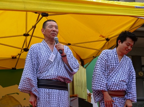 来場者数、主催者発表で18000人だとさ…(汗)。天気予報だと、今日は1日中大雨だという話だったが、それを吹き飛ばす青空&猛暑!途中、少しだけ雨が降ったが、ほんの数分だったか。落語協会の年に一度のお祭り「謝楽祭」の第2回!ここからは、昨年と同様の文章になるが、やっぱり行ってよかった、ホントに!ホントに疲れたけどね…もう暑さにやられてクタクタ。私は11時15分に湯島天神に着き、16時のお開きまでず~っと境内に居続けた。昨年と同じ。ドージンの井上さん・落語マニア仲間のOさんと3人で行動し続けたけど…。これまた昨年同様、友人・知人に声をかけられまくり、こちらからも挨拶しまくり…。--------------------------------------------------------あの炎天下での1日中の立ち仕事、本当に芸人の皆さま方、お疲れさまでした!様々なセレモニーの総合司会が、なんとなんと!我らが林家たけ平ってのも驚いた(苦笑)。当人に聞いたら、いろいろな段取りがほっとんど決まってなくて大変だったらしいが(笑)。いろいろなイベントが催されていたが、13時からのカラオケ大会が、個人的には今日のメーンイベントだと思って、私ゃ楽しみにしていたのョ。私は、たけ平師は「カラオケ大会の司会」だと聞いていたのだが、まさか全部のセレモニーを仕切るんだとは思わなくて、結構驚いた(苦笑)。審査委員長なのに、勝手に歌う大分県の右藤さんと、それに呆れるたけ平師匠の図(笑)。それにしても、たけ平師匠のカラオケ大会の司会は水を得た魚!そして、まあ、やっぱり芸人さんは歌が上手!そして歌真似も上手い!わん丈さんの松山千春、きく麿師の小林旭、扇さんの椎名林檎、小傳次師の中島みゆき。どの方も、ホントに上手くて驚いた!歌い終わった小傳次師。それにツッコむたけ平師。黙々と次の曲の準備をするぼたん師(笑)。そして、林家扇兵衛さんの(木久扇一門ばっかだな)藤山一郎『東京ラプソディ』も良かった!それも後年のキー(Dm)じゃなく、オリジナル盤のキーで軽やかに歌い上げたのには、ホント舌を巻いた。「歌で綴る昭和の時代」に出てくれないかな(笑)?そして、たけ平師匠に僅かでいいから、その歌唱力を分けてほしい…(涙&苦笑)。懐メロがかかると、司会者も審査委員長も揃って笑顔。扇さんの椎名林檎のときの、2人のしかめっ面を撮っとけばよかったな(笑)。ちなみに優勝したのは、林家つる子・春風亭一花・林家あんこの女流噺家三人組のキャンディーズ。つる子さんの「顔圧」が、至近距離だと凄くて(苦笑)。女性の顔をイジっちゃ大変失礼なんだけども。-------------------------------------------------------小傳次師匠、ひろ木さん、時松さん、市楽さん、市江さん、ぼたんさん、一蔵さん、こみちさん、花島世津子先生などの皆さま方に、キチンとご挨拶できたのも良かった。ただ、行きたかったブースが、どこもかしこも長蛇の列で、欲しかったものが何も買えなかった…残念無念(苦笑)。来年は、もうちょっと早めに出かけるべきなのか…ね。