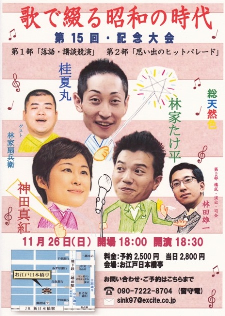 『歌で綴る昭和の時代・第15回記念大会』開催日…11月26日(日)会場…お江戸日本橋亭http://www.ntgp.co.jp/engei/nihonbasi/index.html開場…18時 開演…18時30分 終演…20時45分頃?(予定)料金…(予約)2,500円 (当日)2,800円出演…林家たけ平、桂夏丸、神田真紅 (ゲスト)林家扇兵衛 (歌謡ショー司会&構成)林田雄一第1部…「落語・講談競演」第2部…「思い出のヒットパレード」予約先(メール)sink97@excite.co.jp (電話《留守電》)09072228704下記のメールアドレス・番号でもご予約・お問い合わせを承ります。 4890mffs@jcom.zaq.ne.jp 0ps388121401v2y@ezweb.ne.jp 090-4183-20282012年1月末に、第1回が「お江戸両国亭」で開催されて、5年10か月の歳月が流れ…ついに迎えた、第15回大会!!先だって、夏丸さんと『東京かわら版』編集部にお邪魔し、大宣伝を敢行してまいりました(笑)。そのときの写真、Twitterに上がっております(苦笑)。私は後ろ姿だけにしておきましたが…。そして、あれから殆どの歌唱曲目も決まり、構成作りに入りつつある状況であります!(噺家としては)初ゲストの林家扇兵衛さんの曲目ももちろん決定済み!戦前・戦中から昭和50年前後の歌まで、なつかしの歌を数多く取り揃えてお送りする豪華落語会!落語ファン・講談ファン・昭和歌謡ファン・『なつかしの歌声』ファンの皆さま方!是非、お友達をお誘いのうえ(笑)ご来場くださいませ!