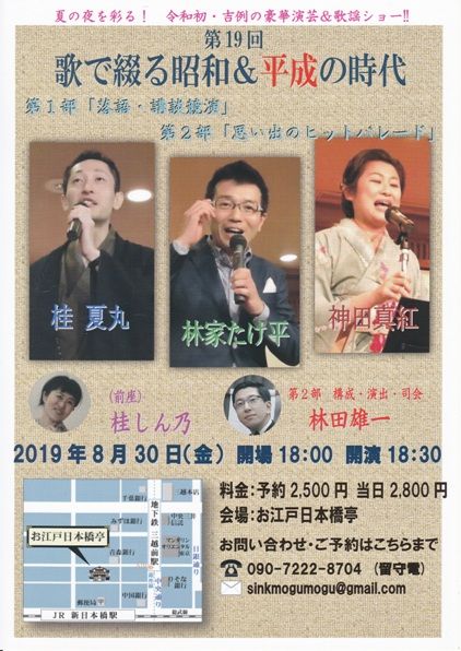 さあ!ほぼ9か月ぶりに、吉例公演が帰ってまいりました!令和になってしまったので、第19回目にして公演タイトルがリニューアルされました(夏丸師の意向)!比較的、新しい年代の歌まで拡大してお送りすることになる今回からの公演!是非ともご来場くださいませ!「第19回・歌で綴る昭和&平成の時代」開催日…2019年(令和元年)8月30日(金) 会場…お江戸日本橋亭http://www.ntgp.co.jp/engei/nihonbasi/index.html開場…18時 開演…18時30分 終演…20時45分頃(予定) 料金…(予約)2,500円 (当日)2,800円 出演…林家たけ平、桂夏丸、神田真紅、桂しん乃 (歌謡ショー司会&構成)林田雄一 第1部…「落語・講談競演」第2部…「思い出のヒットパレード」 予約先(メール)sinkmogumogu@gmail.com (電話《留守電》)090-7222-8704 下記のメールアドレス・番号でもご予約・お問い合わせを承ります。 4890mffs@jcom.zaq.ne.jp 0ps388121401v2y@ezweb.ne.jp 090-4183-2028---------------------------------------------------------------今回から、平成の歌も少々入ってくることになります。司会者としては、正直言ってやりにくいことこの上なし!でも「昭和の懐メロには興味ねえよ!」と思って、今までお出でにならなかった方こそ、今回は是非とも。…とか何とか言っちゃって、たけ平師と私の2人だけは相も変わらず戦前~戦中~戦後のSP盤時代の流行歌を追っかけまわしていくという(苦笑)。しかも!今回、たけ平師が歌うのは本当に珍曲…というか、ディープな懐メロ好きしか知らない戦前の歌を歌います!正直、私もうろ覚えの歌(笑)。というわけで、皆さまのご来場をお待ちしております。