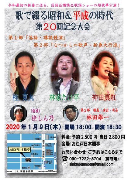 さあ!開催まで1週間となりました!ご予約がまだの方はお早めにご連絡ください。当日入場よりホンの少~し安く入れますので(笑)!令和最初の初席を飾る、落語&講談&歌謡ショーの3本立!たくさんのご来場、心よりお待ち申し上げます!「歌で綴る昭和&平成の時代・第20回記念大会」開催日…1月9日(木) 会場…お江戸日本橋亭http://www.ntgp.co.jp/engei/nihonbasi/index.html開場…18時 開演…18時30分 終演…20時45分頃(予定) 料金…(予約)2,500円 (当日)2,800円 出演…林家たけ平、桂夏丸、神田真紅、桂しん乃 (歌謡ショー司会&構成)林田雄一 第1部…「落語・講談競演」 第2部…「なつかしの歌声・新春大行進」(司会:真紅&林田) 予約先(メール)sinkmogumogu@gmail.com (電話《留守電》)090-7222-8704 下記のメールアドレスでもご予約・お問い合わせを承ります。 4890mffs@jcom.zaq.ne.jp 0ps388121401v2y@ezweb.ne.jp今回は、4月からの朝ドラ『エール』の主人公のモデルであり、生誕110年を迎えた、古関裕而先生の曲を中心に歌のショーを構成いたしました。また真紅さんの講談も、古関先生を扱うと聞いております!私も古関メロディーを、歌真似で披露させていただきます!…ただいま久々に練習中ですが、大して似てないのは(苦笑)どうかご了承くださいませ(最悪だ…)。