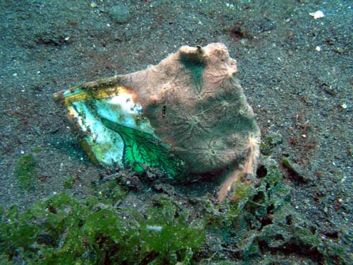 プラスチックのお菓子の袋は、半分砂にうもれサンゴ?に