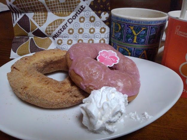 何方かのブログで・・ミスドで生クリームがついて・・売っているというのを見た!早速出かけて買いました。勿論TOよぉ生クリームだけを別に買ったら・・30円+消費税だったかな? 付けて食べたら超甘い~