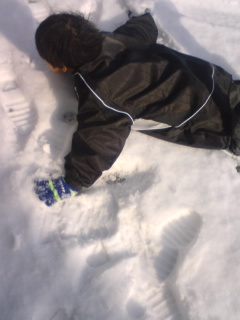 孫ちゃんと息子は 雪合戦 もしたり、寝転んだり・・