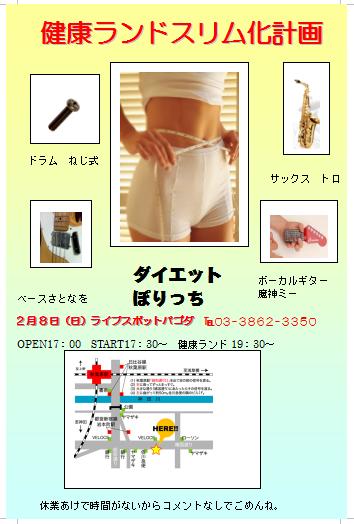 こんばんわ。とろっちです。LIVEの詳細が決まりました。タイトル 健康ランドスリム化計画場所 秋葉原ライブスポットパゴダ 日時 2月8日(日)OPEN17:00 START17:30~ 健康ランド出演時間 19:20~3バンド中、3バンド目(つまり、最後)の出演です。打ち上げにも一緒に行きやすいですね。ご来場お待ちしてます。