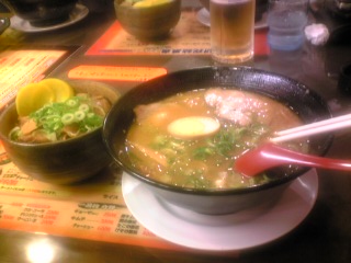 夜にレイさん、すかいさんと京都駅近くのラーメン屋へ。 少し前にレイさんとメッセで話してて、行きたかった店「京都ラーメン研究所」へ行って来ました。和風とんこつラーメン+チャーシュー丼のフルセットを注文。 ラーメンはまあまあ、チャーシュー丼はうまかった! チャーシューがなかなかの味。 2人は別のもの頼んでたけど、微妙やったみたいよ。 帰ってから気づいたんだけど・・・ うちが行きたかったの「京都ラーメン研究所」じゃなかった(爆) 「めん馬鹿一代」のほうだったという罠ww 次は来週末だっけ?w
