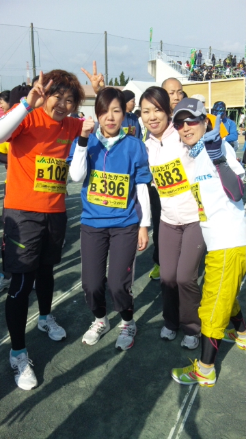 きのうは高槻シティ国際ハーフマラソンに出てきた。去年12月の半ば頃から右足のハムストリングスが痛んでいて、なかなか直っていない状態、それに加えて、前の週のスノボで左足首を捻ってしまっている。こんな状態ではひょっとしたら走ったらアカンのかもしらん。けど、なんかリタイアって言うのはイヤやった。とにかく走るだけ走ってみよう。LSDになってもかまわんし、途中ホンマにアカンかったらやめたらいいし、NAOMIに置いて行かれるかもしらんけど、それもしゃぁないと思っていた。できたら今回はNAOMIのペースメーカに徹しよう。スタートしたのは参加選手のほとんど最後尾。参加したのはこんなメンバープラスのりおさん。スタートした直後は狭い道路を直角に曲がったりして、渋滞している。たぶん、このときにもし俺が記録をねらおうとしていたらイライラしたかもしれないし、ちょっと無茶な走り方をしたかもしれない。でも、今回はとにかく走れたらいいってな感じだったので、みんなと一緒に流れにまかせる。最初の2キロを通過した時点で14分。まずはこのペースで走ると2時間15分は厳しいと、NAOMIやYUMIちゃんに声をかける。そこからちょっと廻りがすいてきて、ペースが安定してくる。だいたいキロ6分ちょいぐらい。途中、俺が油断してしまって5分半ぐらいまで上げてしまって、クレームを受ける。だんだん調子に乗ってきて、その後はキロ6分を少し切る位で安定。このあと、結局みんなばらけてしまって、俺とNAOMIだけの併走に。途中、なぜかキロ5分になった時があったけれど、これはたぶん距離表示がおかしかったんやと思う。中間点で1時間3分の後半あたり。このまま行けば、NAOMIの自己記録更新は間違いない。でも、実はこのあたりからNAOMIがしんどそうなのは感じていた。逐一ラップを伝えながら、元気づけようとするけれど、あんまり言い過ぎると苛ついているのがわかる。このあたりでは、スタート直後のロスを完全に取り返して、キロ6分平均に戻してきている。ただ、15キロあたりでは徐々に俺との距離が開きがちになってきていた。ここで、一瞬俺に欲が出てしまった。ここからキロ5分弱で走ったら、2時間を切ることができるかも。もう、NAOMIも最後まで粘るだけやし。そこまでは俺は全然元気やったから、なんかいけそうな気がしたんやけれど、やっぱり練習不足。思うように伸び無いどころか、キロ5分を切って走ったのはほんのちょっとで、そのあとは逆にペースが落ちていっぱいいっぱいになってきた。残り3キロ。なんと驚いたことに、NAOMIが俺に追いついてきた。わぁ、ひょっとしたら俺が置いて行かれるかも。っと思ったけれど、NAOMIもいっぱいいっぱい。ちょっとでもNAOMIを引っ張ろうと、そこから俺も気を取り直してがんばる。でもって、最後まで併走しながらゴール!なんとNAOMIは自己記録を10分以上更新して、2時間3分24秒!NAOMIも決して、ここまで万全な準備ができたというわけでは無かったので、この記録は立派。2時間を切るという目標もちょっと見えてきたしね。参加した他のメンバーもそれぞれの走りを。このあと、みんなで温泉に行ってしっかり疲れを癒し、のりおさんちで打ち上げ。MAKIさんに何から何まで準備をしていただいて、ホンマに申し訳なかったけれど、めっちゃおいしくいただいた。今回、自分の記録としてはアカンかったけれど、めっちゃ楽しい時間を過ごせた。今日は、筋肉痛が残っているけれど、それもなかなか心地よい。
