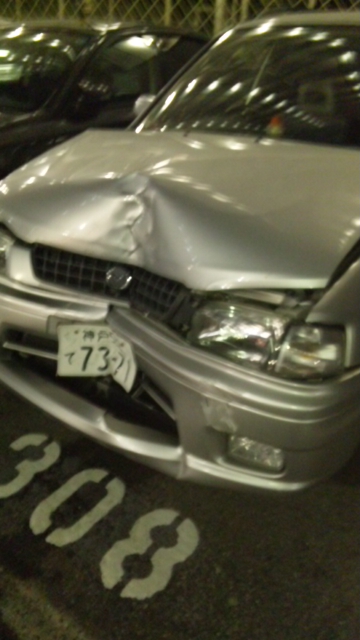 今日の夕方、ココを散歩させていて、なにげに俺の車の方を見たら、何か俺の車のすぐ後ろになんだか不思議な状態で車が止まっている。でもって、その近くにおっちゃんが2人。離れたところから見ると、なんかその車が俺の車にひっついているように見える。ん?おそるおそる近づいてみてびっくり!!俺の車にほかの車が食い込んでいる!しかも俺の車はその勢いで横にずれていて、その向こう隣の車にぴったりひっついて寄り添っている。んんん???なんじゃ?こりゃ!よくある年配の女性がブレーキとアクセルを踏み間違えたってヤツらしい。どうやらぶつかった以降も押し続けたらしい。左後ろからぶつかっているのに俺の車は斜めにゆがんで、右前のタイヤが縁石に乗り上げ、さらに前のコンクリート塀に前がぶつかっている。ぶつかった車はこんな感じ。俺の車はこんなになって・・・車の後ろに書いてある309と言う数字がちょうど駐車スペースの真ん中。その真ん中より俺の車がどれだけ押されたかがよくわかる。その向こうの車とひっついてしまっているので車を動かすこともできず、JAFのレッカーを呼んで引き離してもらったり、警察の聴取を受けたり・・・たまたま車の近くを通ったからよかったけど、もしこれが1週間ずれていてスノボ行っているときやったらどうなってたかな?なんて色々考えた。まぁ、人に怪我がなかったからよしとするか。明日の高槻ハーフマラソンに車でいくつもりだったけど、急遽電車で行くことにした。まぁ、それもよしと言うことで。