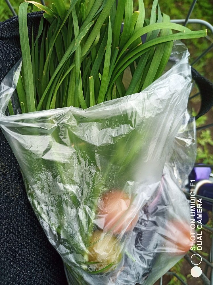 今日の収穫は、ニラ、トマト、いんげん豆、ナス2本です