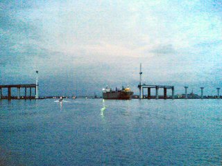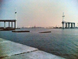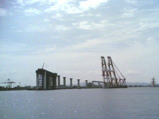 富山新港に架ける「新湊大橋」の主塔設置工事が今週末にあるということで、大型クレーン船を見に行きました。設置工事は7/3と7/5。あいにく出張中。工事は、V字を逆さにした主塔を吊り上げて、土台に取り付けるというもの。高さは100メートルを超えるそうだ。車が走る目線にしたって、新湊で一番高いところになるのでは・・・。出張から帰る頃には、2本の主塔の取り付けが済んでいることでしょう。見に行くついでに釣りがしたい・・・。[ 大型クレーン船 ]大きいものを見ると喜ぶ性質なもんで[ 夜釣り風景 ]今度釣りに行くときは両方に主塔があることに