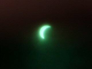富山では75%ほど欠けた日食。私は天体望遠鏡用のサングラスレンズをかざして肉眼で観察していました。写真は仲間の一人が撮影したもの。どうやって撮ったのかと聞くと、溶接用の面で見ながら撮影したそうだ。なるほど!26年後はそうするのにするよ。富山での見られた日食の様子(10:50頃)溶接用の面ごしに観察したり、写真を撮ったとのこと。キーワード:日食、カメラ、撮影、サングラス