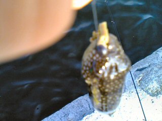 久しぶりに早起きして釣りに行ってきました。狙いは「何か釣れたらいいな~」という程度。そんなに長い間する気はないので、ガルプを使いました。すると、憎いフグ岸壁近くまで引いてくると、フグが器用にガルプを食べます。しかも集団で・・・。勘弁して欲しいけれど、ときどき大きい魚の影も見えます。我慢してると、次は、コチが可愛く見える結果は惨敗。夜に出直します。