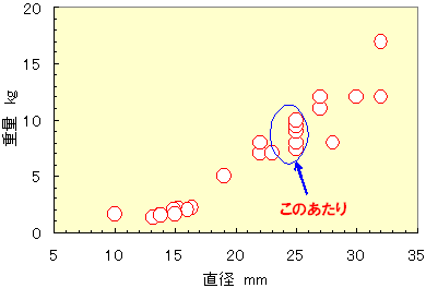 町内の納涼祭に初めて参加することになりました。皆さんが集まって、お酒を飲みながら懇親を深めるというもの。その中で「スイカの重量当て」ゲームがありました。凝り性なのか、くだらないことを考えるのが好きなのか、インターネットを使って、スイカの直径と重量の関係を調べました。次のグラフを参照~。スイカの直径と重量の関係キーワード:スイカ、直径(cm)、重量(重さ kg)Keyword: water melon, diameter, weight15cm前後のものは、いわゆる「小玉スイカ」です。私達が一般的にお店で買うのは 22~25cm のものになります。グラフを見てもらうとわかるように、重さは 7~9kg と幅があります。おそらく、手に取って、ずっしりとするスイカを買うでしょうから、重めに解答すればよいだろうと予想!さて、実際にスイカを見て、そして手に取り、ずっしり重く感じたので、「 7.8kg 」と予想しました。結果は「 8.4kg 」。長く生きたおばあさんの何となくという予想の前に敗れ去りました。結論:8~9kgで書け。10kgを超えるのは、よっぽどのスイカだけだ!