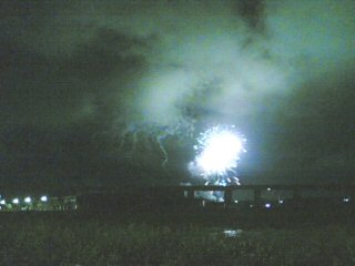 8月2日に行われた新湊(富山新港)の花火大会。生憎の雨模様で、やるのかな?と思っていたら、8時半頃から打ち上げはじめました。海王丸パーク沖と東堤(白灯台)の2箇所で上げています。8月に入ったというのに、じめじめと梅雨模様。せっかく綺麗な花火が上がれども、煙に隠れてしまって、大輪の全容を見せることはありませんでした。残念です。古い携帯のカメラでは夜空に光る花火を撮影するのは難しいです。建設中の新湊大橋の向こうに花火を見る東堤(白灯台)で大玉を打ち上げ