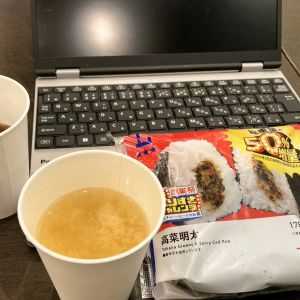 朝食は、近くのコンビニで買ったおにぎりと、ホステルで提供されている味噌汁。