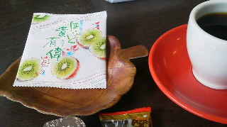 岐阜県関市の道の駅【ラス テンほらど】で営業の合間 をぬってコーヒーブレイク。 駅長が高校の同級生。コー ヒーをおごってもらいまし た。洞戸はニュージーラン ドの気候と似ているという ことでキウイ栽培が盛んで す。付いたお菓子はキウイ せんべい。キウイがせんべ い内に封じ込めてありまし た。