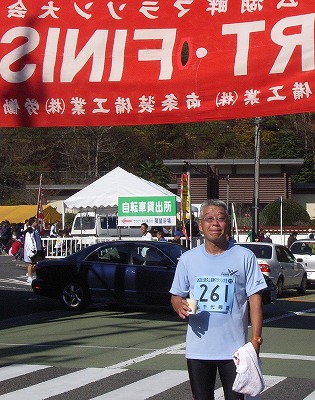 ハーフ。タイム1時間48分20秒。昨年より1分ほど記録更新できた。まずはメデタイ とても気持ちの良いコースだった。1kmあたり、5分8秒くらいのペースとなる。目指すは1時間40分=100分を切る事。これが厳しい。1km 4分40秒のペースで1時間38分。1km、30秒縮めれば良いのだが、僕には大きな壁だ。10kmまでなら、4分台で走りきったことは何度もあるが、ハーフになると、5分をきると頭の中で危険信号が点滅する。オーバーペースで、完走できなくなるのではないかという恐怖心が出るのだ。でも、いつかは乗り越えないとね。これができればフルマラソンも楽に走れるはずというのが僕の持論だ。こういう大会でよく顔をあわせる近所の人がいる。なんと69歳。47歳の僕は現役バリバリ、発展途上の筈だ。いつかは、なんて言わないで、本年度中に何とかしたいと思う。