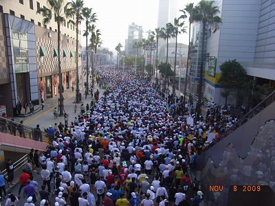 無事、完走。 タイム5時間3分参加者 約7千人! スタートの合図があっても、微動だにせず。やっと少し動き始めたのが1分後。スタートラインにたどり着いたのが、3分後。人とぶつかることを心配しなくてすむ程度にまわりに空間ができたのは、10kmほど走った頃でしたコースはとても景色が良かったです。特に海にかかる橋の上は最高に気持ちの良いものでした。ただし、この日はとても暑く、しかも終盤になってのきついアップダウン。これにはかなりこたえました。これはゴール直前、手前500mくらいでしょうか。ずーっとスローペースだったせいか、終盤はこれまでに無く元気でした。ふだんは、ラスト10kmは、気力だけで足をひこずるようにしてゴールするのですが、この日はラスト3kmが、一番速かったかもしれません。それにしても、ゴール直前になってもこんなにまわりに人がいるのは初めてです。無事完走。タイムはちょっと不本意ですが、練習状態、コース、天候などを考えれば、完走できただけでも良しとします余談ですが、会場でスーツ姿の人とすれ違い、どこかで見た人だなあと思ったら、安倍元総理でした。途中で追い抜いた人に、元巨人の宮元投手、丸山弁護士がいます。ゲストランナーだったそうです。さて、ゴールの後は、いつも僕のホームページと、メルマガの管理をしてくれているMさんと合流。最高の生ビールを飲みました。そして、一日つきあって、写真もとってくれた女房に感謝です。