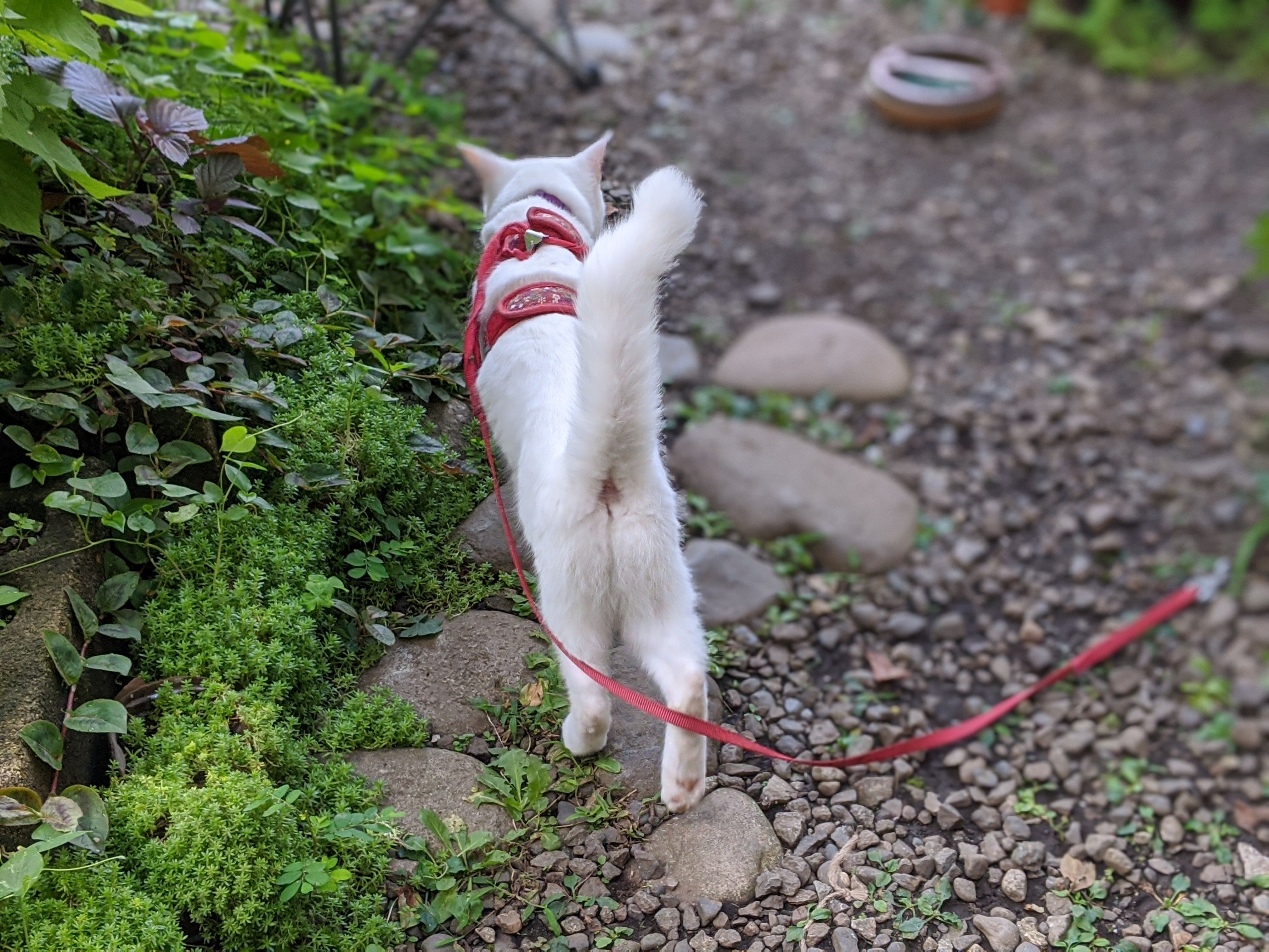 朝、とうさんに、お猫さまが自ら、ハーネスを棚から落として、放牧をせがまれたそうです。