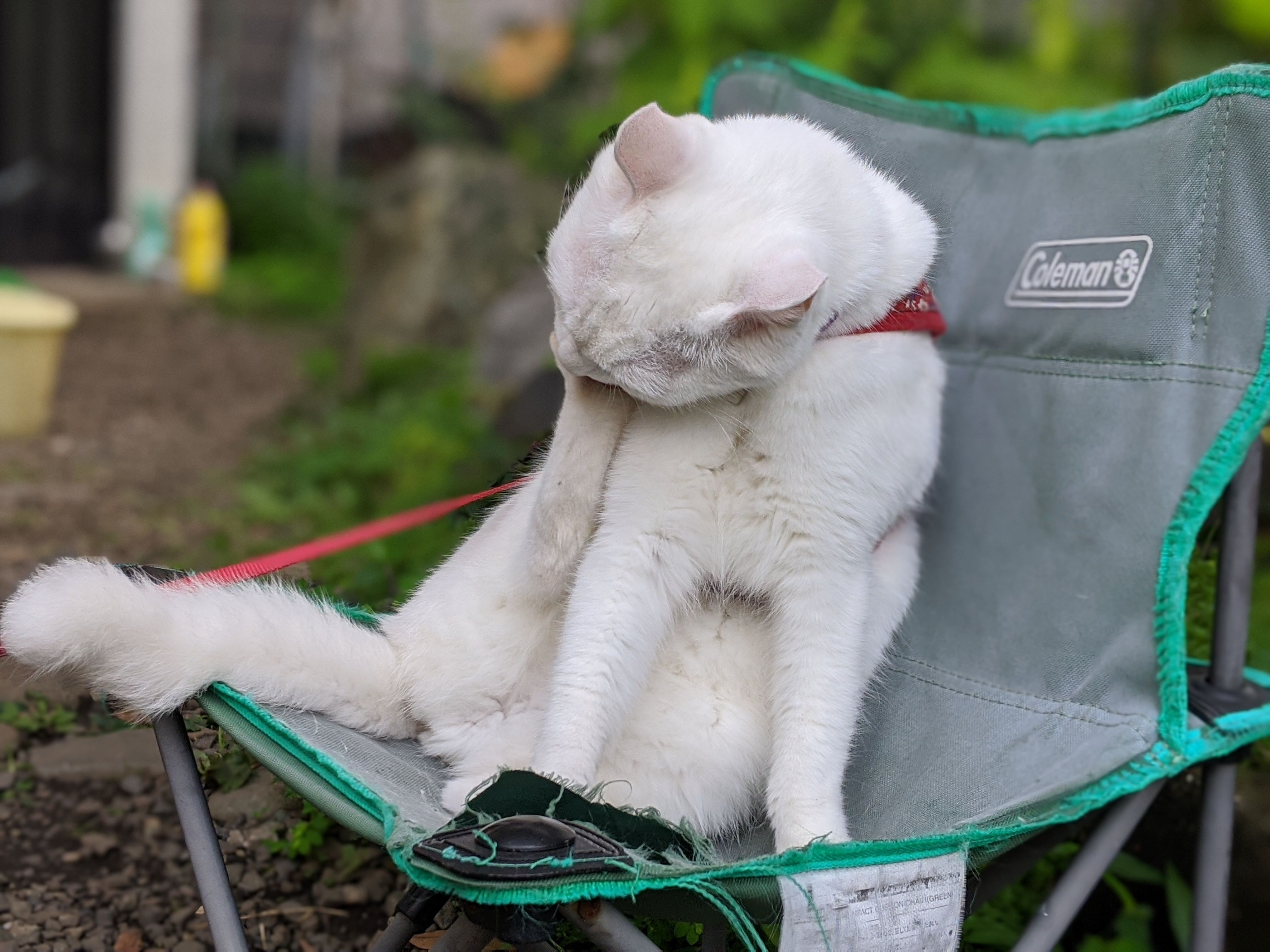 ハーネスについている紐が絡まったり、飽きてお家に入りたくなると鳴いて呼びます。