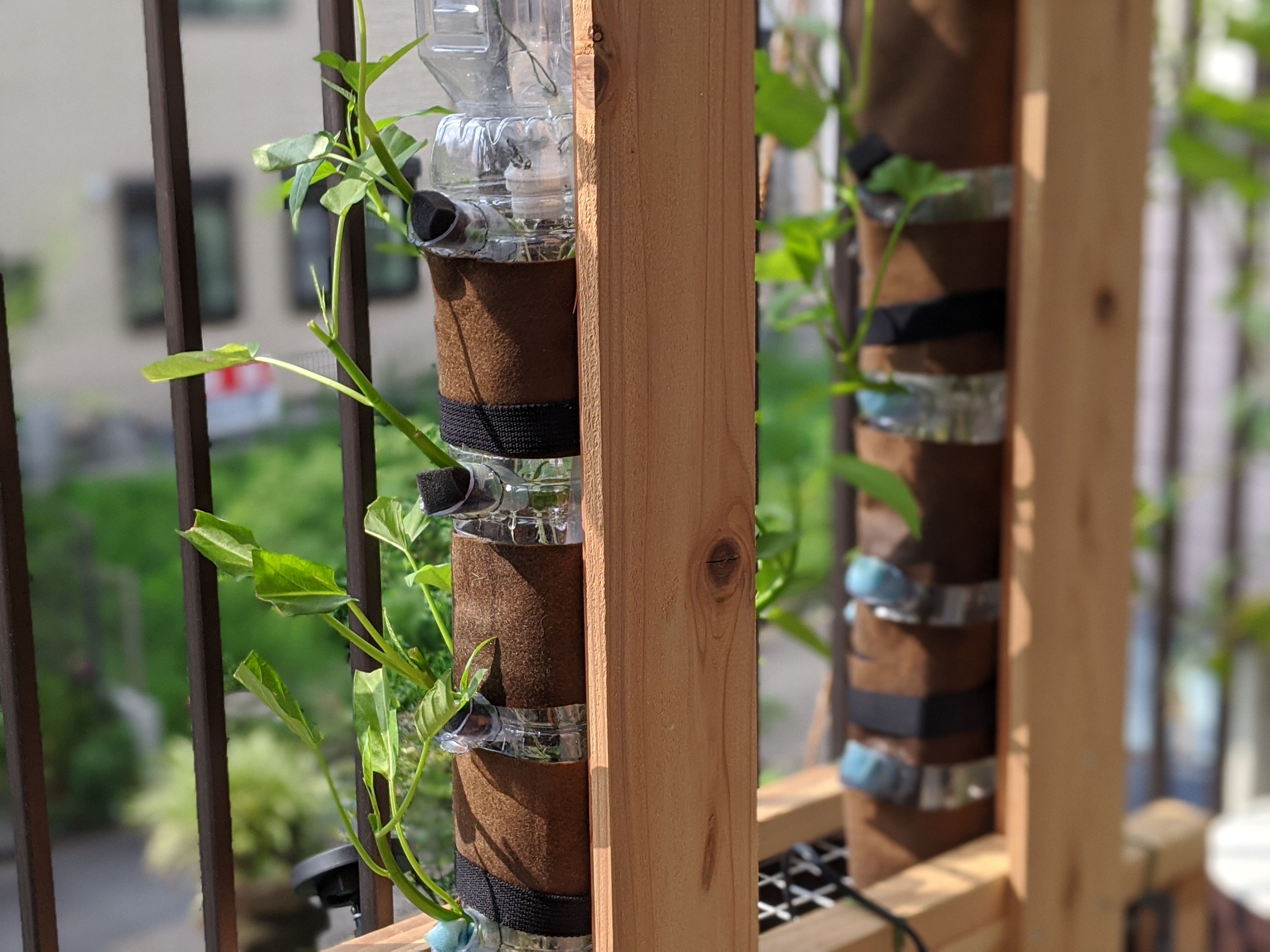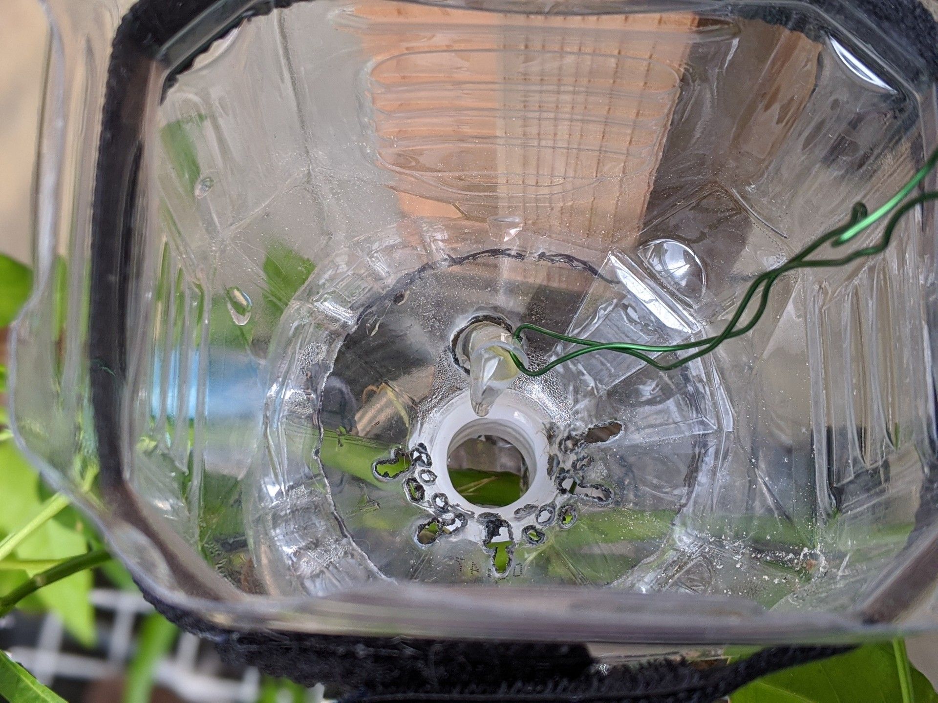 管からの出方を微調整。ペットボトルの口から通していた管を、横穴から出しました。