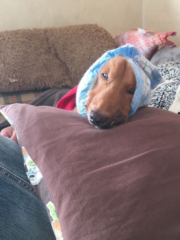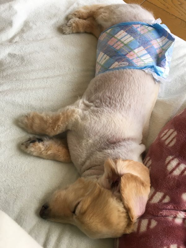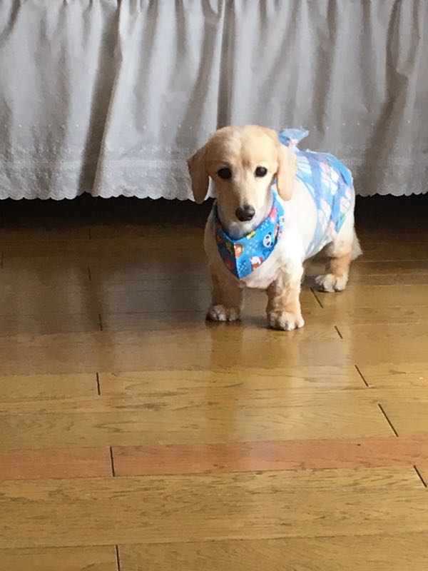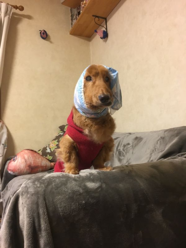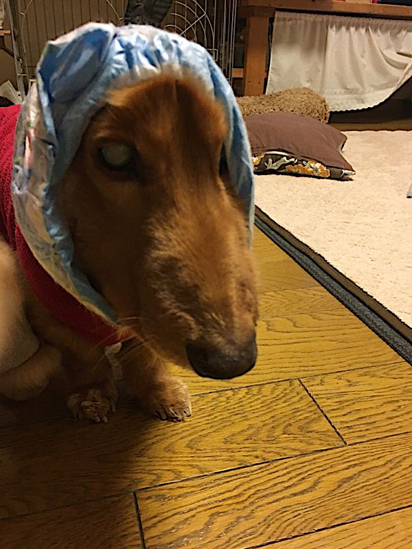バリカンで刈った後 汁が出て まわりの毛が コペコペに ガーゼとかは 傷に貼り付いて 取れないから 悩んだ挙句 ひらめいた‼︎ 傷に貼っても くっつかない紙を巻いて オスワンコ用 オムツを顔に巻いたら いいじゃん! 汁は オムツが吸収してくれるし 見た目は えっ?って思われるかもだけど 可愛いく見えるぜ
