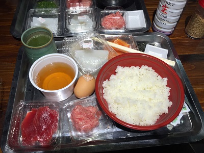 普通の食堂もあったが、今回は市場の中で切り分けられた刺身を選んでごはんを別買いして海鮮丼にする仕組みの店にした。