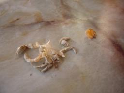 夏から飼いだしたおかやどかり「やどちゃん」その後です。前回の日記以来ヒーターを入れてあげて元気に遊んでおりました。数日前からピンク色の貝にはいったやどちゃんがすごーい、食欲だったそうな(飼育担当、旦那さんのコメント)で、その後砂の奥の方にもぐりなんだか冬眠チック。で、飼育担当者が「なんだろかぁ?」と思いやどちゃんを砂のおくからだしてみたところなんだか動かない。「死んじゃったー」と思った飼育担当者、みんなで「えーーー、やどちゃんーん」と呼んでみるも応答なし。そっかーぁ、とよくよく見ていたら「なんか変じゃない、これ」と私。よーく見ると抜け殻っぽい。で、飼育担当者指でつついたり触っていたりしたら脱皮みたく抜けちゃって・・・??? 「もしかして・・・脱皮!!?」よーく見ると貝の置くに何かいるぞぉ?そう、どうも脱皮してる途中だったみたい。やどかりってよくわからないんだけど脱皮するんですよーで、大変なことに新しく生えてきてはさみ部分がポロって取れちゃったの。ひえぇぇえぇぇ・・・・・・ 左が抜け殻で右が新しく生えてきたはさみ。痛々しいわ・・ごめんよーやどちゃんとりあえず他のやどかりに食べられないように隔離して様子見です。やどちゃんどうぞご無事に復活してね