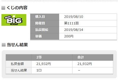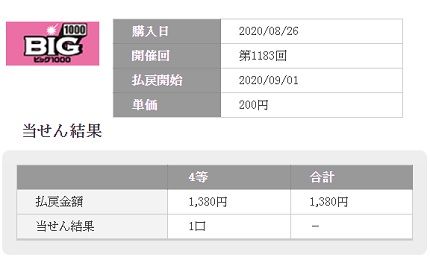 楽天toto で購入した、「BIG1000」で4等が当せんしました。