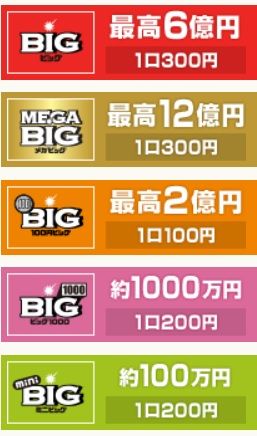 1等の当せん金は、最高12億円(MEGA BIG)から、100万円(mini BIG)まで幅広いです。