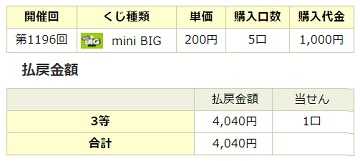 第1196回の「mini BIG」で、3等が当せんしましたヽ(^o^)丿。