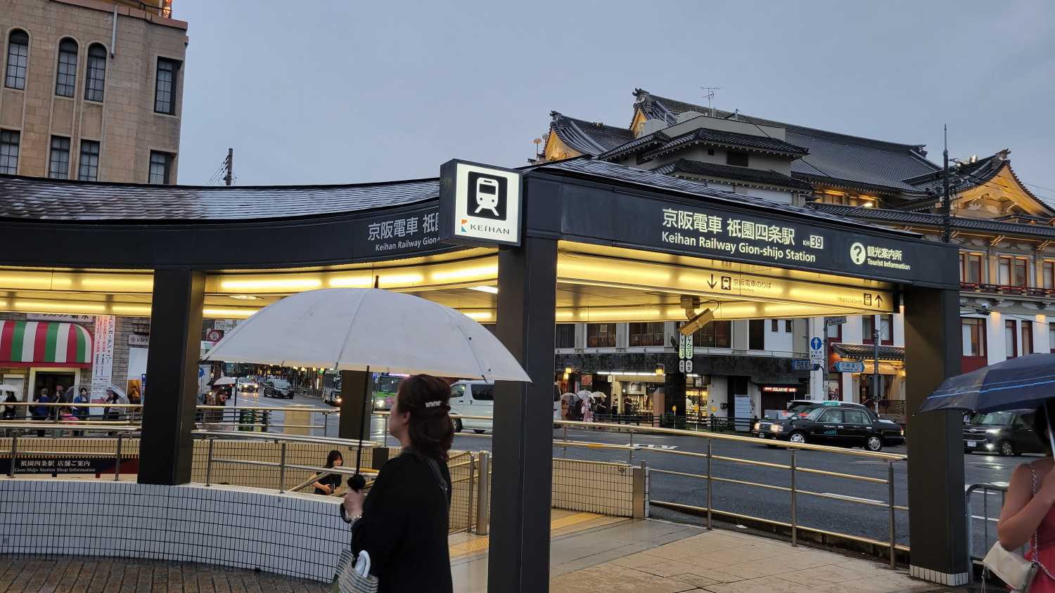おけいはんで京都入り!今回の旅行では、京阪の京都府内の駅では乗降客数が最も多い駅で降りました。 京阪本線 祇󠄀園四条駅(ぎおんしじょう)駅ナンバー:KH39位置はこちらです Wikipediaの記載を読み解くと…・2008年に「四条駅」から改称 烏丸線の四条駅との混同を避け、祇園への誘客アップを狙った・2022年の乗降人員は35,978人/日 京都府内の京阪の駅では最多 三条駅の方が多いと思っていたが三条駅は3位・阪急京都線の京都河原町駅まで徒歩5分 定期乗車券のみ阪急との連絡運輸を取り扱っている ※連絡運輸:他社線との通しの乗車券を発売することところで、駅名「ぎおん」の漢字、地図では「祇園」、パソコンの漢字変換でも「祇園」しか出ませんが、駅名は「祇󠄀園」です。※「ぎ」の文字のしめすへんは「ネ」ですが、一部のスマホでは「示」の方しか表示されないようです。ご了承ください。 まずはホームから。京阪本線は、七条駅から終点の鴨東線出町柳駅まで地下線になっていて、ホームは地下2階です。当駅のホームは1面2線、つまり、緩急接続(追い越し)はできない構造です。追い越しをする場合は、1駅北の三条駅で行います。1番線は、三条・出町柳方面、もうすぐ終点の列車が入ります。2番線は中書島・枚方市・淀屋橋・中之島線方面、これから大阪方面へ向かう列車が入ります。のりばはこれだけなので、表示をよく見ておけば間違わないでしょう。ホームには物販店があります。よく見て来なかったけど… 地下1階が改札階です。改札口の内側。のりこし精算機が2台あります。改札口はこの1カ所のみです。 改札口を出ると、スターバックスはじめいくつかのショップがありました。八坂神社や祇園の最寄り駅でもあり、観光案内所もあります。大きな駅ではないですが、京阪での京都市内最多旅客数を誇る駅だけあって、利便施設がコンパクトにまとまっています。地上に出ましょう。 祇󠄀園四条駅の地上出口は9番まであり、どの出口から出るかによって印象が違うと思いますが、4番出口から出るのが一番印象的かも。地上に出て振り返ると、早速、ビルですが和風を前面に押し出したビルが目に入りました。松竹の「南座」です。なお、6番出口は南座の正面に出るそうです。祇󠄀園四条駅の地上を南北に通る「川端通」(京都府道37号)は、地上を走っていた京阪本線の線路用地を活用し開通した道路。京都市内の道路としてはかなり新しいので、京都特有の「南北の通り名+東西の通り名」の法則で付名された交差点が少なく、並行している鴨川にかかる橋の名を交差点名称にしている交差点が多いそうです。ここの交差点名称も”川端四条”ではなく「四条大橋」です。鴨川と道路との間に建物はないので、分かりやすく現実的ですね。 祇󠄀園四条駅の4番出口は鴨川に面した位置に出ます。川の対岸は先斗町。夏の季節は、鴨川に面した飲食店が仮設のテラス席を設ける「納涼床」が風物詩でとても有名。日暮れを迎え、床席に灯りが点き始めました。しかしこの日は雨…。~南座に近く好立地~祇󠄀園四条駅周辺のホテル 四条河原町温泉 空庭テラス京都 別邸 THE GATE HOTEL(ザ・ゲートホテル) 京都高瀬川 by HULIC ホテルミュッセ京都四条河原町名鉄 三井ガーデンホテル京都河原町浄教寺 京都の宿 ぎをんの月 倭乃里京都ミュゼ 祇園側・河原町側双方からピックアップしました! 四条大橋を渡ると、そこは繁華街「河原町」です。画像中央のビルが、阪急京都線・京都河原町駅の駅ビルです。先ほど「祇󠄀園四条駅~京都河原町駅間は徒歩5分」と紹介しましたが、四条河原町の信号が青ならば3分ほどで着けそうです。あそこまでは行かずに、先斗町の路地に入りました。次回は、雨の先斗町。(つづく)