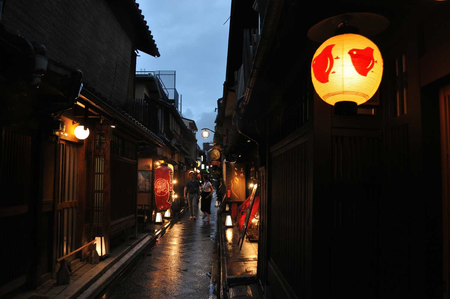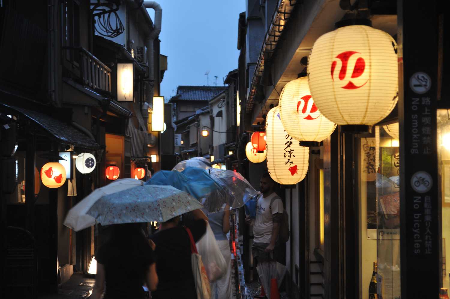 祇󠄀園四条駅から四条大橋を渡ってすぐ。京都五花街のひとつ「先斗町」(ぽんとちょう)を、南から北へ向かって散策しました。京都河原町=阪急、祇󠄀園四条・三条=京阪、三条京阪=地下鉄 雨降りの中、大勢の観光客の姿があり、少しごった返し気味でした。 提灯に灯りが入り、雰囲気が出てきました。 有名な花街ですが居酒屋やバーも多く、「祇園よりは敷居が低い」と、昨年散策した時のガイドさんからお聞きしました。 ちょっと遊んでみました。酔いつぶれて、本当にこうならないように 京の夏の風物詩(いくつもありますが)「納涼床」。鴨川に面したお店では、納涼床(ゆか)という仮設のテラス席を設けるのが恒例で、今年も多数の飲食店が床を作っていました。 ただし、この日はご覧の天気…。どの店も床席にはお客を入れておらず。我々も今宵は床席を予約していたのですが、ついてないなあ…。なお、雨天に備えて、床席予約数分の室内席を必ず空けておくことになっているそうです。 古い佇まいの店舗が軒を連ねる先斗町。ちょうど、川側が広く開いている区画があり、店舗造の建物を横から撮影できました。何だか、昭和50~60年代の「いい日旅立ち」「ディスカバージャパン」「エキゾチックジャパン」みたいな写真に。※どれも、旧国鉄が展開した大型旅行キャンペーン 先斗町は、サクサク歩けば10分かからない短い小路なのですが、見どころ撮りどころが沢山あって、なかなか前に進みません(苦笑)。次回も先斗町の街並みをご紹介します。~夜の先斗町を心ゆくまで~京都・先斗町周辺のホテル四条河原町温泉 空庭テラス京都 ホテルグレイスリー京都三条 クロスホテル京都(オリックスホテルズ&リゾーツ) ソラリア西鉄ホテル京都プレミア 三条鴨川 ヒルトン京都 プリンス スマート イン 京都三条 列車・バスでのアクセス・阪急京都線「京都河原町」・京阪本線「祇󠄀園四条」「三条」・地下鉄東西線「京都市役所前」 ↑京都駅から地下鉄で来る場合はココ(のりかえ1回)・市バス・京阪バス「河原町三条」「四条河原町」 または「三条京阪前」「四条京阪前」・スカイホップバス京都「京都市役所前」