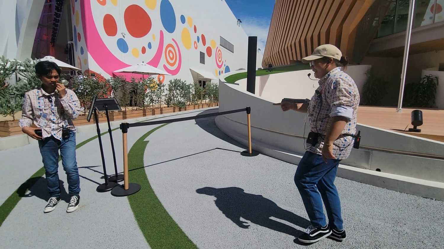 インドネシアパビリオンは、ある程度の人数をまとめて入館させるスタイル。先のグループが入館すると列を進めるために、 ススンデクダサイソング(?) で誘導してくれました