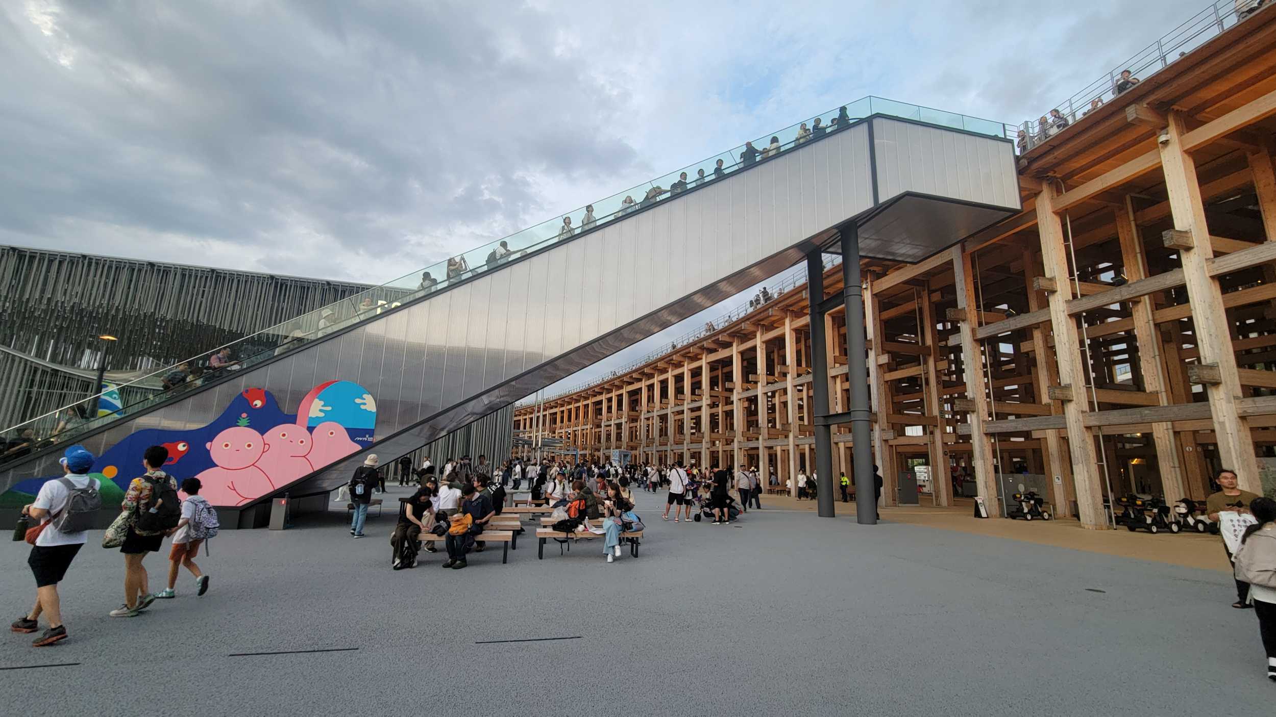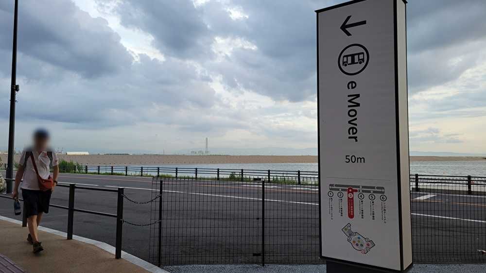 大屋根リングの下のうち、水上にかかる部分は車道になっており、歩行者は通行できません。e-Moverに乗ると通行ができます。
