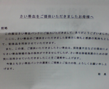 丁度、「自発的断ネット」をしていた昨年末の話になってしまうのですが…私宛に1つの封筒が届きました。そういえば、ちびを産んだ病院でさい帯血を提供したんだっけ…献血のように「針で刺す」とか自分が痛い思いをしていなかったのですっかり忘れていました。い、いや…産むのは痛かったけどさ…量が足りなかったから移植には使われなかったのね…でも研究に使ってくれる、というので「提供は無駄じゃなかったわ」となんとなく良い気分になりました封筒には他にも…ハンカチとステッカーが同封されていました。おぉ~~デザインは「やなせたかし」さんだわもしこれから出産予定のある方で病院(産院)に臍帯血バンクがあったら是非、協力してみてくださいね~~ ランキングに参加していま~す