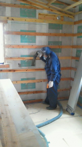 国分U様邸セルロース吹き込み中です。TSデザインの標準の断熱材セルロースファイバー寒い冬でも底冷えなし、すきま風なしの快適な住まいの重要な部材なんです。調湿性もあり、日本の気候風土にあった、理想的な断熱材です。調湿性といえば、昔は土壁が当たり前でしたね。たしかに先人の知恵で、日本の気候風土にあってはいるのですが、いかんせん 断熱性がよくないのが欠点ですね。あと工期はかかるし、費用はかかるし、現在は土壁ができる職人さんも少なくなって来ました。その調湿性 断熱性を併せ持ったのがセルロース断熱材。どちらか一方だけではだめなんです。両方の昨日をもった、自信をもっておすすめできる断熱材。みなさんも家をたてるときは断熱材には絶対にこだわりましょうね。