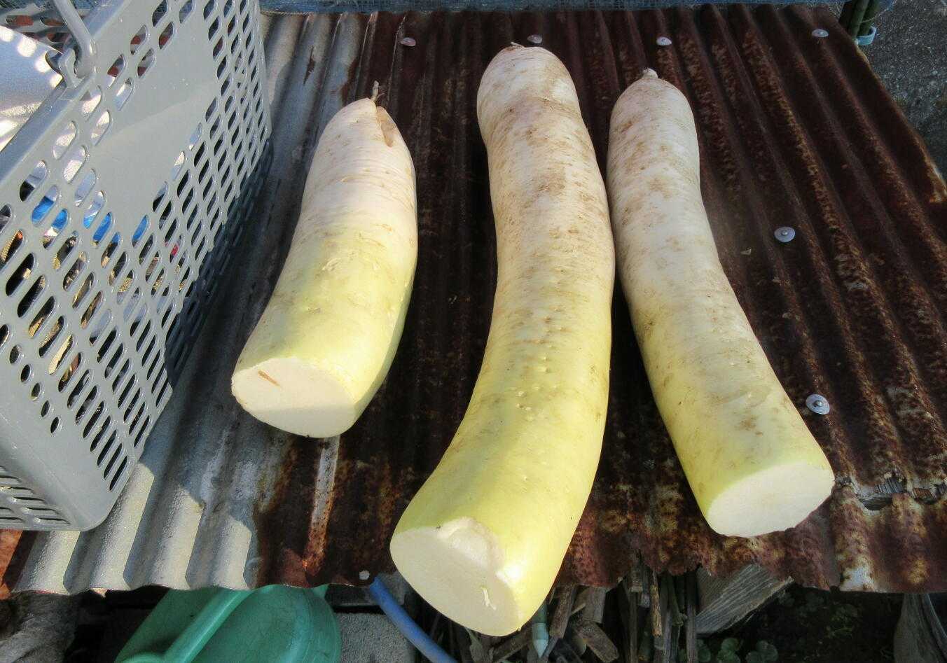 どうもっ・・!可も無く不可も無く始まった週明けでしたが明日の夜から寒波とかKANPA~~~ソレホドデモぉ~~!に期待、。、。、・木曜日キュウリがもう少し。。。右は晩白柚の差し穂一度成功したけど枯れてその後挑戦するも失敗だらけ。。。小松菜デッカクなりすぎで茎がふっとい・・!KUKKI~~黒豆用の枝豆のネットを外したんん~~~中を見たらまだ赤かった黒くなるのだろうか・・?もう干してる家もあるのに。。。ショウガを全て掘り上げた予想よりショボかった10株程度幾つかは土に埋めといた・・!腐るけど。。。大根カブをどんどん大根はデッカクなってて中は少し黒い筋も入ってる今年のカブは綺麗でよく育ってるいつもなら虫に食われて消えているのに。。。暑かったので虫も暑かったのだろうか・・?聖護院はもう少し先。。。ほうれん草をズバッと午前中に収穫したけど曇りだったのでネットを掛けて帰宅風の心配だけ。。。午後に菊芋を掘る3株トリアエズ甘酢漬けようのだけ持ち帰り。。。。残りは鉢にいれて土を掛ける・・!一部は種用に。。。白絹病は大丈夫だったかある程度順調。。。じゃ