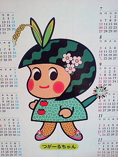 次に発見した不思議はこれ!バス停の待合所の壁に貼ってありました。とってもかわいいけど、なんだか変???なに!これ?早速、調査を開始。お名前は「つが~るちゃん」、女の子のようです。頭はスイカの縞模様。頭の前にはアンテナをつけています。稲穂の触覚です。横にはりんごのお花の髪飾り。頭のカタチは青森県つがる市の「つ」のカタチ。着ている洋服はメロンです。あみあみ模様が素敵です。胸のボタンはトマトですって。尻尾がついてますね。ネギ坊主の尻尾です。足には長イモ柄のタイツを履いているのだそうな。靴にはゴボウのお花の飾りをつけています。なるほど、なるほど、納得です。スイカ、長イモはつがる名産です。「屏風山スイカ」という名前で売られるスイカは高級品です。お米は「つがるロマン」というお米がおいしいですよ。トマトもゴボウ、ネギもよく採れます。もちろん、りんごは超有名ですよね。岩木山のふもとでとれる「つがるりんご」は格別おいしい!つがる市で採れる農産物8品目をつかってのキャラクター。見ているうちにだんだんかわいくなっていました。みなさまはいかがですか??「着ぐるみ」もつくったみたいですよ。誰が中に入るのかしら??ただいま準備中!!のようですね。つぶ美人0号でした。