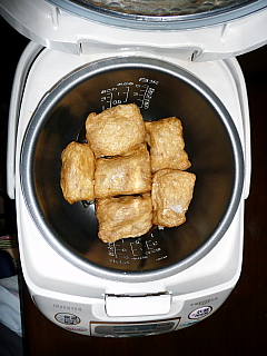 5月19日、11時より「つぶ美人の会」5月・2回目を開催しました。今回のつぶ美人さんたちは3名さま、そしてお子様たちです。だんだんと夏らしい季節になっています。もちろんカラダも夏に少しづつ変わってきていますよ。夏のすごし方と毎日のお食事へのアドバイスをHOMEにのせました。どうぞ、ご覧ください。今年の夏は、「冷え」をカラダの中に入れないように頑張ってみませんか?お腹に腹巻をしたり、下着のパンツを2枚はいてみたり、ソックスの2枚履きをしてみたり。なにか、チャレンジしてみませんか?ソックスは5本指のシルクをはいて、その上に綿の足袋のように二股のソックスをはくのがおすすめだそうです。先日、参加した「ほっぺにチュ!」の講師、長谷川先生のおすすめです。私も大賛成です。 ないしょですが、実は私の夏の定番はパンツスタイルの腹巻をつけることです。おへその周りにはたくさんの大事なツボがあります。冷やすとたいへん!お腹が温かいと全身も温かいですよ。薄着をする夏にこそ腹巻は必需品です。 さて、夏に向っての今回のメニューはつぶ美人さんたちのたっての希望で ●「圧力鍋で一気につくるおいなりさん」です。簡単にお稲荷さんができる調理法をどうしても見て覚えたいというご希望です。夏もまだまだ始まったばかり、「お稲荷さん」の再登場でもいいですよね。ところで、つぶ美人の皆さん、圧力鍋を持っていない方もいます。ということで、圧力鍋でなくてもできるかどうか、皆さんがお出でになる前にチャレンジしてみました。 まずは、電気釜で炊いてみた結果、だいじょうぶ!うまくいきます。 ほら、だいじょうぶでしょう! でも、電気釜って底の面積が小さいので数ができないですよね。おいなりさんを2段、3段と重ねてつくってもうまくいくのかしら?ちょっと心配。これもチャレンジしてみないといけませんね。ほかに、ルクルーゼのお鍋もいいかもしれません。土鍋もきっとおいしくできそうな感触。どなたかチャレンジしてみたいつぶ美人さんいませんか? ●好評です!大根とSEAFOODSの炊き合わせ。 大根の上に冷凍のSEAFOODSをのせて(陰陽調和させます)、お醤油とみりんと市販のめんつゆをいれて、圧力鍋で5分、おいしい炊き合わせの出来上がりです。 ●ちょこっと夏らしくラデッシュときゅうり、レッドオニオンのサラダ。ラデッシュとレッドオニオンはカラダを温めてくれます。きゅうりはカラダを冷やす食材、一緒にいただいてバランスをとりましょう。ラデッシュは葉っぱ刻んで一緒にいれましたよ。夏をちょっと感じて!いただきましょう。 ●本日のお味噌汁「なめこと大根のお味噌汁」です。大粒のなめこと大根をいちょう切りにして味噌汁にしました。自家製の味噌の威力はすごいですよ。どんな食材でもおいしくしてくれます。やっぱり、手をかけたものはおいしいです。おだしは焼き干しを使いました。さぁさぁ、お待たせしました。出来上がったおいなりさんに、つぶ美人さんたち大喜び!子供たちも待ちきれなかったでしょう。さぁ、いただきます!たくさんめしあがれ。 みんなでいただくお食事はおいしいですよ。次回、6月は梅雨に入ってちょっとじめじめしているかもしれません。気鬱にならないよう全身のエネルギーがうまく回るようなメニューを考えたいですね。つぶ美人0号でした。