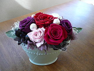 新年ということで弟の新居へお邪魔してきました。箱根駅伝の中継所で有名な二宮というところです。東京駅から1時間ぐらいかかります。湘南電車に乗るとちょっと、小旅行の気分ですね。おみやげは、このお花です。プリザーブドフラワーをアレンジしました。元気で活発そうで、そして少し華やかなイメージでアレンジしました。紫のバラが印象的でしょ。出来上がって、ひとこと、「ベルサイユのバラ」みたい!とても豪華で、やさしさもあるいいアレンジができました。とても満足しています。なかなかいいでしょ!つぶ美人0号でした。