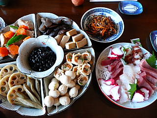 新年、あけましておめでとうございます。皆様どんなお正月をお迎えでしょうか。2009年の元朝はさわやかで気持ちがよかったですね。私は主人の実家でのお正月です。近くの神社へ家族と一緒に初詣にいってきました。そしていただいた「おせち」です。朝からお刺身というのはいかがなものですか?実家が鹿児島の友人の話では、元旦の朝はお刺身が出るそうです。「おせち」もそれぞれ。お雑煮も食べて、元旦の日を過ごしました。皆様もきっとよいお正月をお迎えの事でしょう。今年もよろしくお願いいたします。つぶ美人0号でした。