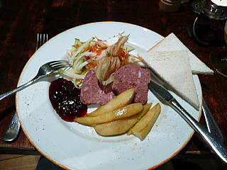 今日はブリュージュで過ごす最後の日です。早めの夕飯を食べようと思って街に出ました。そして、見つけたお店がここです。時間を見たら18時。まだ早い時間です。外に張り出してるメニューはオランダ語らしくまったく理解不能。お店の中にお客はいません。悩んだ末に入る事にしました。席について、メニューを観たらオランダ語でした。オランダ語はまったくわからない。注文を取りにきてくれたのはやさしそうな男性です。彼はオランダ語と英語が少しだけしか話せないらしい。困った。本当に困った。こちらはフランス語すこし、と英語が少し。前菜を説明してくれるのだけど、わからない!バンビといっているらしい。。。バンビ????って?????絵を書いてくれました。鹿の絵でした。なるほど、バンビです。何とか、会話を成立させて頼んだお食事がこちらです。期待した前菜です。鹿肉のパテ。フォークのそばに写っているのはカシスジャム。手前に写っているのは洋ナシをバターで炒めてワインで柔らかく煮ているようです。あとは野菜サラダが添えられています。鹿肉のパテと聞いてココロがわくわくです。甘いカシスのジャムとパテがベストマッチです。なんだかとてもおいしくて感動してしまいました。新しい味です。メインはお魚です。あまりにも前菜に感動して、メインは印象が薄くどんな味だったかも覚えていません。すみません。でも、はずれではありませんでした。これはデザートのタルトタタン。お味は普通。でも、林檎の上に載っているほうずきのようなフルーツ。とても珍しいものでした。形はまったく日本のほうずきと同じ。でも、たべられるのです。甘くてすっぱくて初体験のお味でした。これで32ユーロでした。ごちそうさま!おいしかった。もう一日ブリュージュに滞在できたらよかったけど、明日はブリュッセルへ出発です。