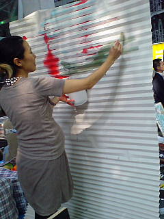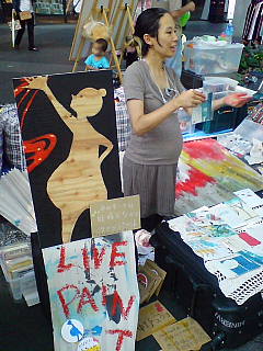 このあいだ、いい出会いがひとつありました。お相手は、とても元気な素敵な妊婦さんです。聞くところによると、出産の予定日は9月25日だったような。いつ生まれてもいい状態なんだとか・・・・・・。せっかくだから、妊婦姿でライブペイントをやりたいと思っている!と聞いたときにはちょっとびっくり!でも、軽やかにのたまうのをきいたら「それはいいね!」と、「やるんだったら連絡してね」と口に出していました。それから約1週間後、彼女は有楽町の国際フォーラム地上広場に出現していました。「妊婦姿でライブペイント」、フリーマーケットをしながら、なんと絵を書いていました。着実に実行していました。気持ちの軽さと動きの速さに脱帽です。