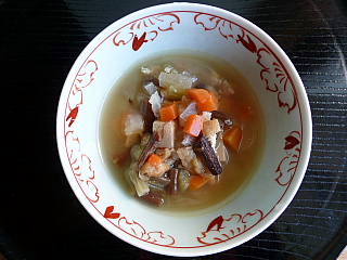 青森県津軽地方に伝わる「けの汁」が実家より送られてきました。小さい頃から食べなれた母の味です。「けの汁」の意味もわからずに食べていました。今ごろになって、「けの汁」って何なんだろうと思って調べてみました。いわゆる女正月に食べた「粥の汁(かゆのしる)」がなまって「けの汁」なったんだとか。そういえば、お正月が終わった頃によく食べた思い出があります。母親の作り方は、煮干と昆布をたっぷり入れてだしをしっかりとります。その中に、さいの目切りにした「大根」「人参」「ぜんまい」「こんにゃく」「フキ」を入れてよく煮ます。さいごに、味噌を濃い目に溶いて、出来上がりです。味噌味はかなり濃い目です。だしもしっかりと濃くとります。いただく時はそれにお湯を足して、自分の好みの味にして食べるんですよ。お餅を入れて食べるのがつぶ美人0号流です。具沢山のお味噌汁。保存が利くのでたくさん作って、好きなときに食べます。本当に大きな鍋につくるんですよ。私もたくさん送ってもらったので、冷凍保存しました。忙しい時にお味噌汁代わりにいただきます。野菜たっぷりで、お味噌だから体も温まります。もちろん、親の愛情もたっぷり。おいしいはずです。感謝、感謝です。