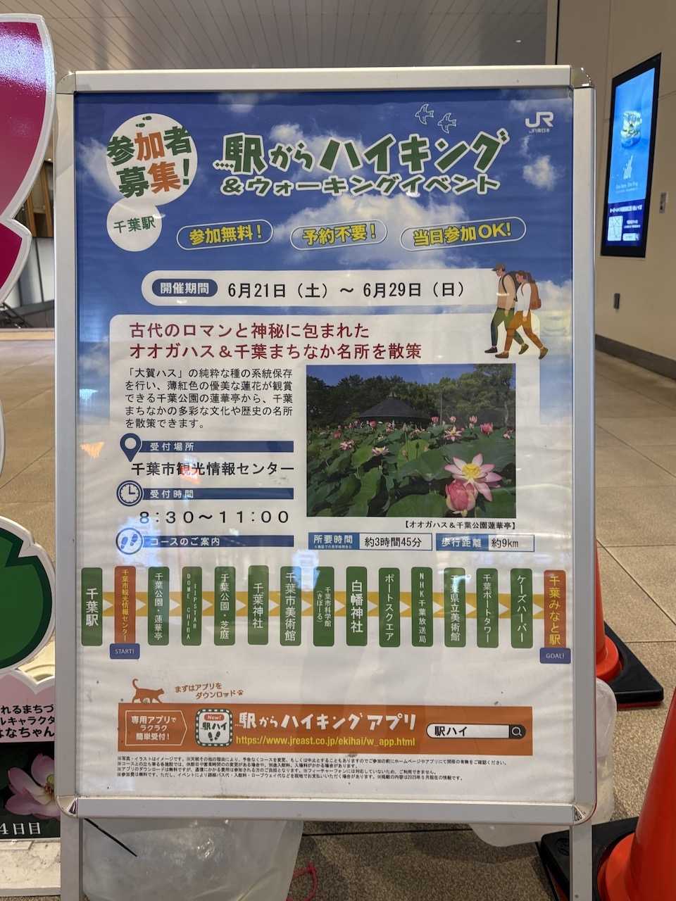 千葉県千葉市駅からハイキング古代のロマンと神秘に包まれたオオガハスと千葉まちなか名所を散策千葉駅から千葉みなと駅へ約9kmのコースですこの日は最高気温が31℃風が強くて少し楽ですスタート!千葉駅から徒歩10分千葉公園です6月29日まで大賀ハスまつり大賀ハスとは...昭和26年千葉の検見川の東京大学グランド地下で発見された蓮の種大賀博士により約2千年前の種と鑑定されたんです千葉公園に植えられ発芽して開花した前日は198輪咲いたとさあせっかくだから写真だけでなくオオガハスガイドに学ぶ匂いかいでみる軽くふわっとう〜んなんと表現するのかな甘さほんのりの中に爽やかな香り葉っぱに触れてみるすべすべしてる葉の上にお茶を垂らしてみる気泡が出てくる真ん中から空気が出てるの花が開く時に音がする?実験したんだって花が開く時にポンと音はしないけど「風流音なら聞こえる...」いい表現だねえ蓮の葉シャワー茎には穴があって葉脈に繋がり水が通るんですガイドさんからいっぱい教わったよ千葉市のキャラクターちはなちゃんにも会えた千葉公園