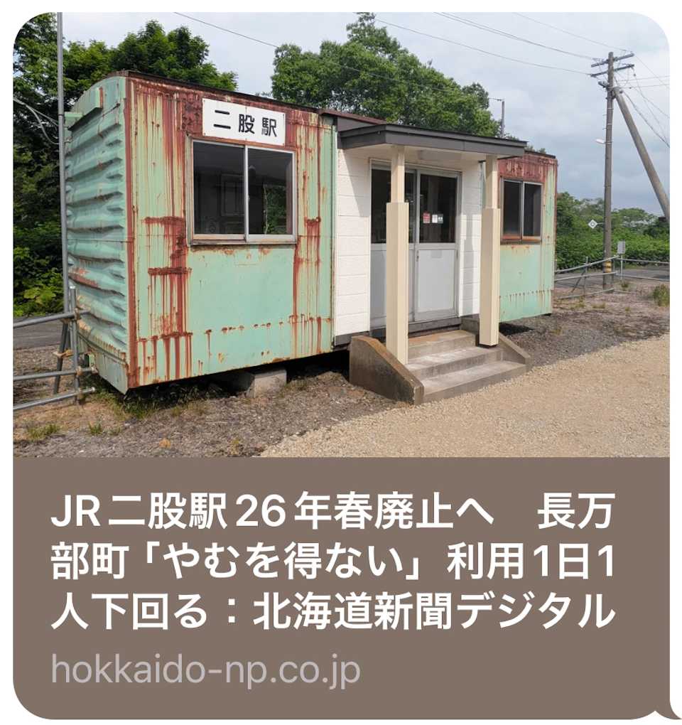 北海道長万部町にある、JR二股駅の廃止が道新デジタルでわかりました。残念です。長万部駅と二股駅の中間地点に、母校の旧長万部中学校がありました。教室から函館本線山線の列車が見えたんですよ。長万部中学校はすでに廃校、そして、二股駅廃止…二股駅は、長万部町双葉地区。昔は双葉小、双葉中もありました。Googleマップで見たら、現在は民家も数軒だけに。交通の要所だった長万部。過疎化が著しいです。長万部の廃駅は、旭浜、北豊津、蕨岱、中ノ沢、そして今回の二股。残ったのは、長万部、静狩、国縫だけに。故郷の思い出が消える、淋しいです。