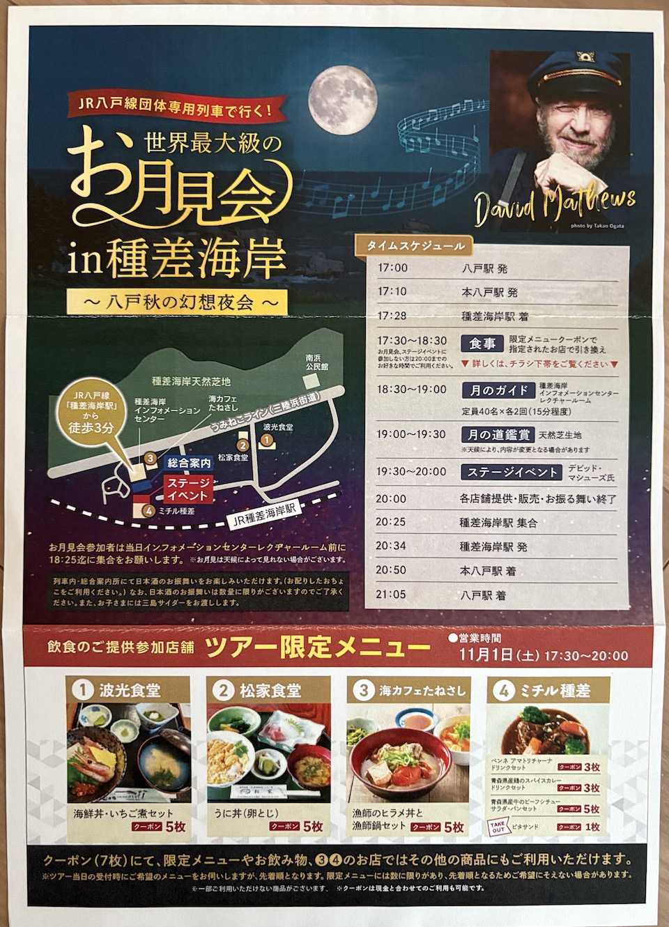 青森県八戸市です八戸線団体列車で行く世界最大級のお月見会in種差海岸どの辺が世界最大級なのかよくわからないけど参加予約はしていましが朝から雨風強くなっててホントにやる?とりあえず集合場所の本八戸駅に行ってみたら...「倒木のため、八戸線が不通」バスに変更で開催するって80名の参加です種差海岸インフォメーションセンター到着最初に食事が提供です海カフェたねさしひらめ漬け丼と漁師鍋八戸ならではの海鮮食事美味しいに決まってるよ地酒八仙のおふるまいという名の飲み放題...ピンクのラベルの純米吟醸が旨すぎるね月のレクチャーこの日は十三夜の月草野心平さんが種差海岸から昇る満月のことをザボンの月🌕と表現していますよさあ、外に出てみましょう朝の暴風雨が止んで十三夜の月が輝いてた朝の暴風雨からして奇跡だよねお月見会ですそして...再び八仙のおふるまいでお酒をいただきミチル種差へ日本酒飲みながらジャズコンサートですグラミー書受賞のデビッド・マシューズさんは八戸に住んでいるんですよそれも奇跡だよねデビッド・マシューズさん率いるバンド演奏が素敵すぎる酔いましたね〜クーポン券でお土産買ったよ奇跡のようなビックリお月見会でした!